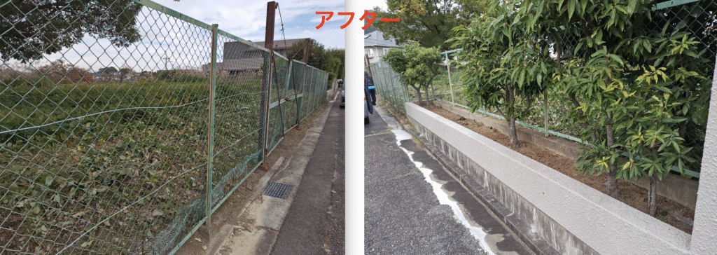 ビフォーの写真では、フェンス沿いにツタや雑草が生い茂り、通路の確保も大変な状態でした。
